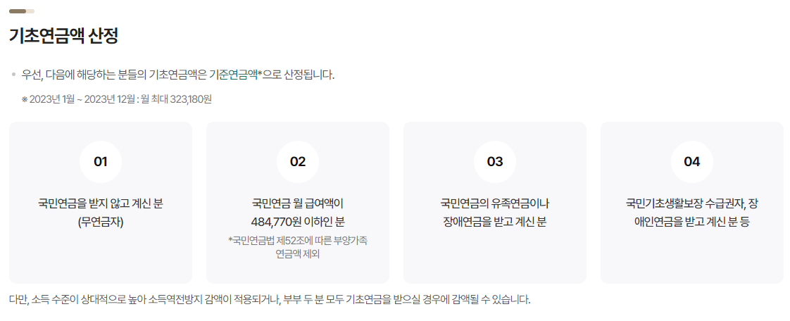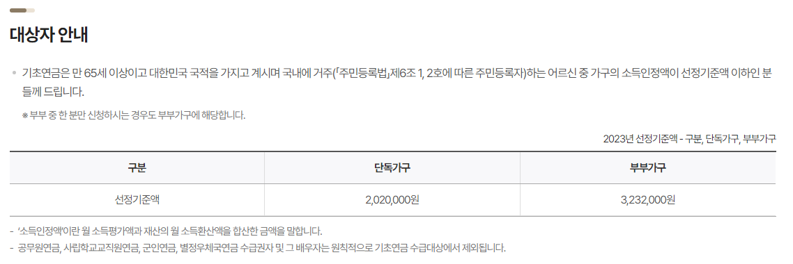 단, 소득인정액이 단독가구 기준 2,020,000원 이하, 부부가구 기준 3,232,000원 이하인 분들만 수급 가능합니다.