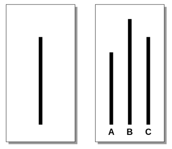 우리가 대중과 반대에 서는 것을 얼마나 두려워 하는지 알 수 있는 유명한 실험이 있다. 바로 사회심리학의 선구자로 불리는 솔로몬 애쉬(Solomon Asch)의 동조 실험이다. 그는 실험 대상자들을 모아놓고 아래와 같은 두 개의 카드를 준 뒤, 왼쪽에 있는 선분과 길이가 같은 선분을 오른쪽 A, B, C 중에서 찾으라는 아주 간단한 실험을 했다.