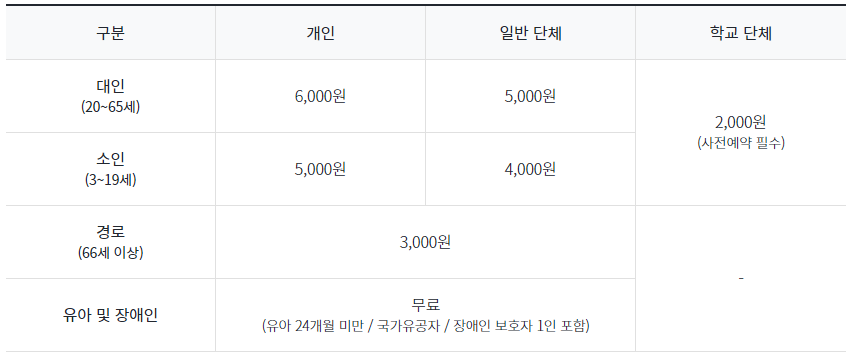 7월 16일까지 리뉴얼 공사로 부분 개관중입니다. 해당 기간 동안에는 입장료가 할인가(대인 2천원, 소인 1천원)로 적용되며, 리뉴얼 이후에는 아래 요금제가 적용됩니다. 운영시간은 평일 09:00~17:00 / 주말 10:00~18:00 입니다.