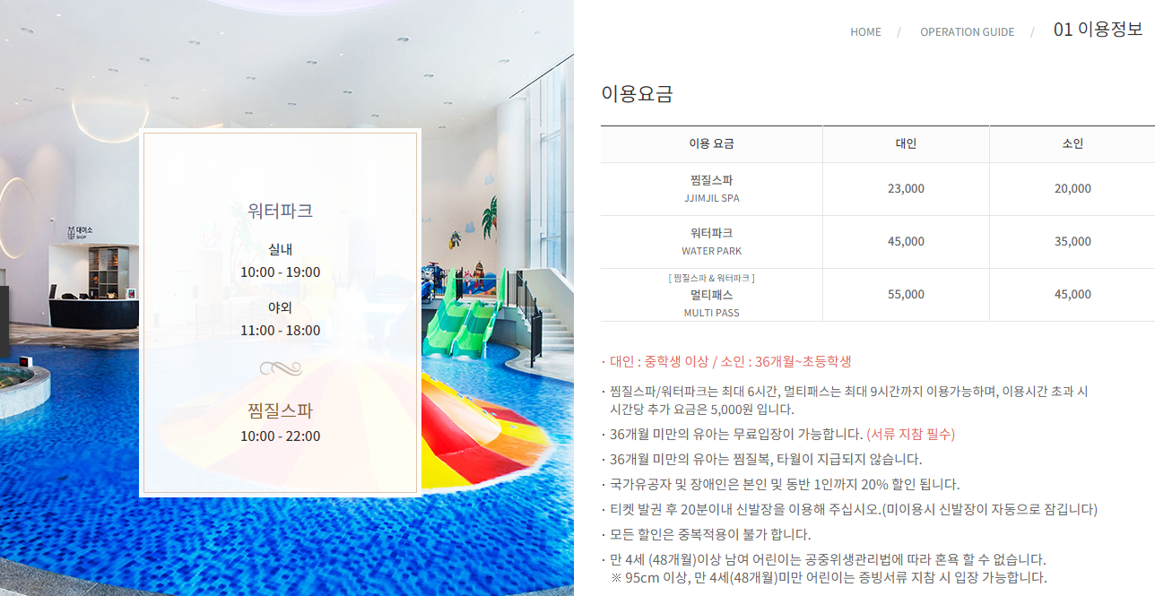 안성 아쿠아필드는 찜질방과 워터파크가 같이 있지만 각각만 이용하는 것이 가능합니다. 저는 아직 워터파크는 이용해보지 못했는데 찜질방이 규모가 워낙 크고 키즈 놀이터 등 아이들이 좋아할만한 시설들이 잘 갖춰져 있어서 찜질방만 이용해도 충분했었습니다. 이용 시간 및 요금은 아래를 참고하세요. 36개월 미만은 무료 입장 가능합니다.