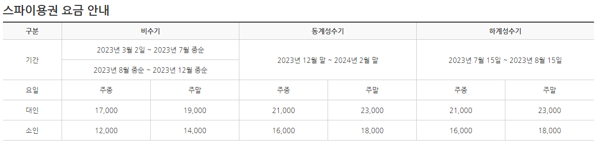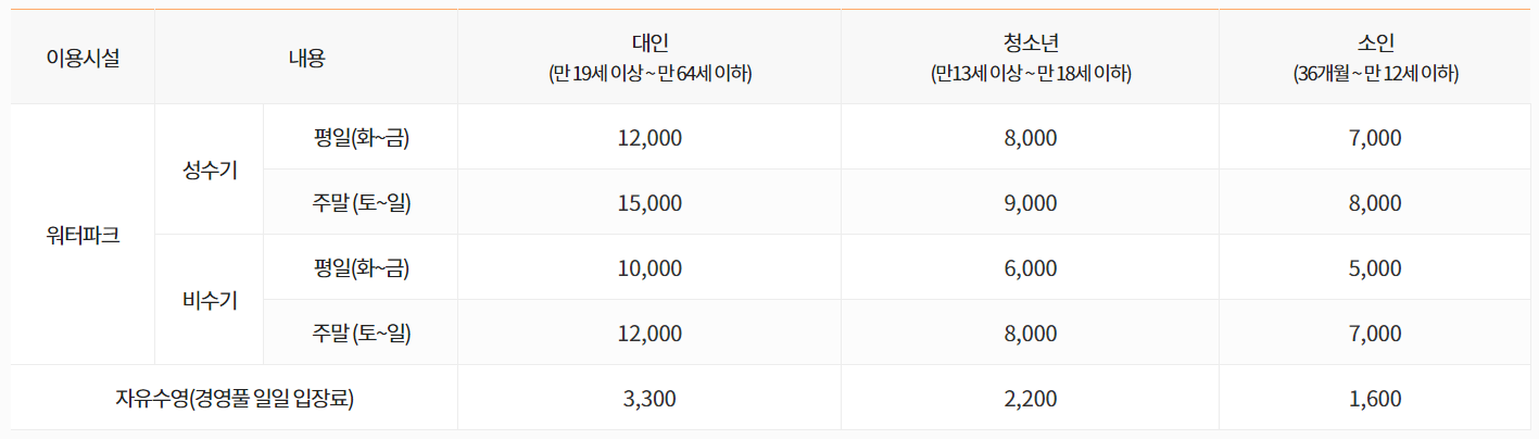 이용요금은 어른 아이 모두 2만원이며, 24개월 이하는 무료입니다.