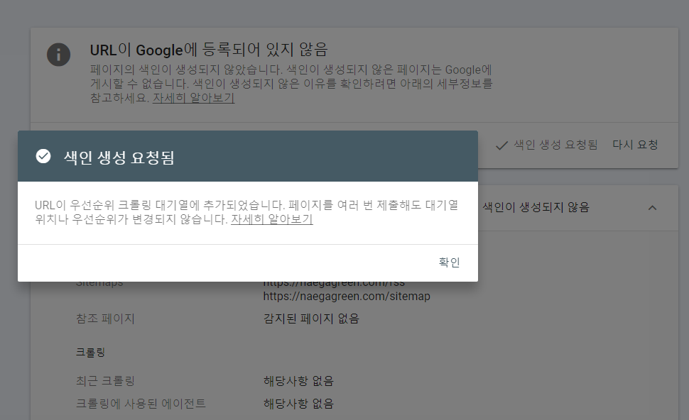 그러면 팝업 창이 하나 뜨면서 실제 URL의 색인을 생성할 수 있는지 테스트 중이라는 문구를 확인할 수 있습니다. 1~2분 정도 기다리면 '색인 생성 요청됨'이라는 팝업 창으로 바뀝니다. 이제 수동으로 구글 검색엔진에 페이지 등록이 끝났습니다.