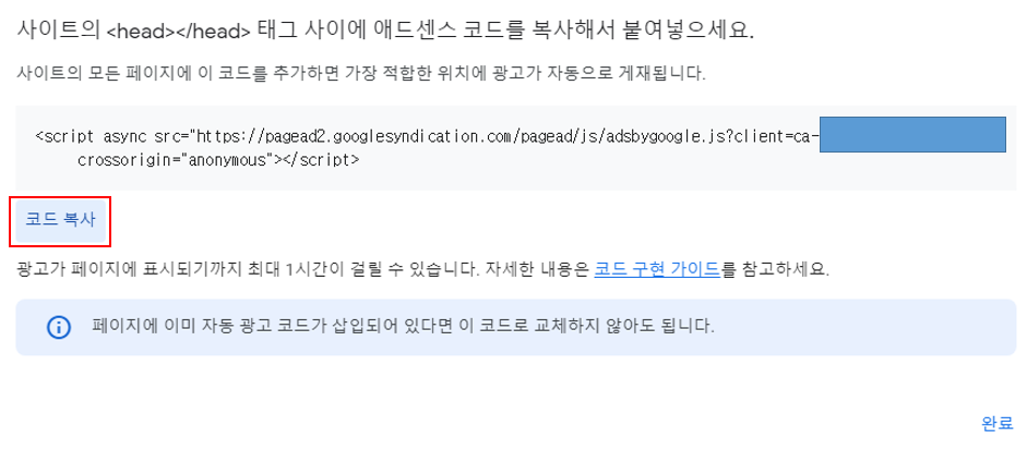 <head> 와 </head> 사이에 첫 번째 블로그에 있는 구글 애드센스 광고 코드를 복사해서 붙여 넣기 하면 설정이 끝납니다.