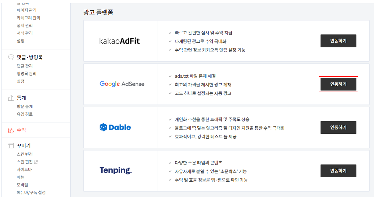 티스토리 수익 메뉴 → 구글애드센스 연동하기 클릭 후 구글 계정으로 로그인하여 연동을 진행합니다.