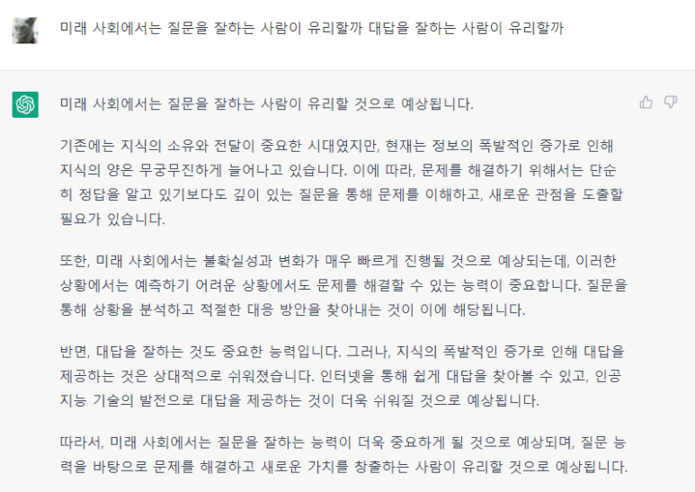 이전에는 인터넷을 검색하거나 책을 통해서 필요한 정보를 찾아서 정리해야 했다면, 이제는 그냥 질문하는 것만으로도 잘 정리된 답변을 얻을 수 있다. 그리고 이런 상황을 마주하면서 얼마 전 포스팅했던 최진석 교수의 말이 더욱 더 피부로 와닿았다. 앞으로의 세상에서는 '대답'을 잘하는 사람은 점점 더 설자리를 잃을 것이라는 나의 생각과 '질문'의 중요성을 강조한 최진석 교수의 관점이 일맥상통하기 때문이다.